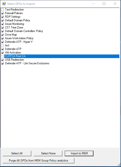 The tool grabs all GPOs in the domain and loads them into a simple GUI to select for upload to MEMC. It them converts them the selection into XML reports and uploads them to MEMC using Graph. Once authenticated, it can also purge all existing uploaded GPO reports from the analytics tool as well.