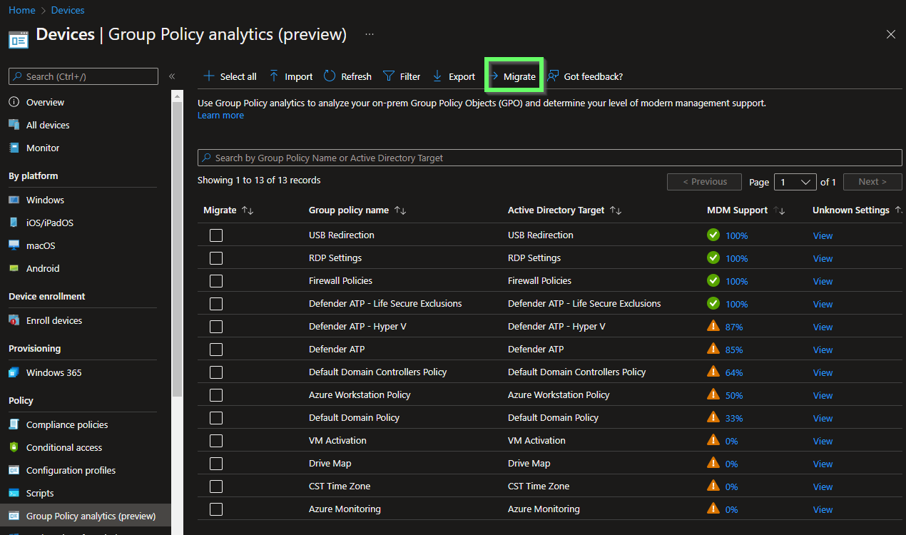 After the GPOs have been converted and uploaded, the newly added migration function can then take over and hopefully make short work of converting applicable GPOs to MEM policies.